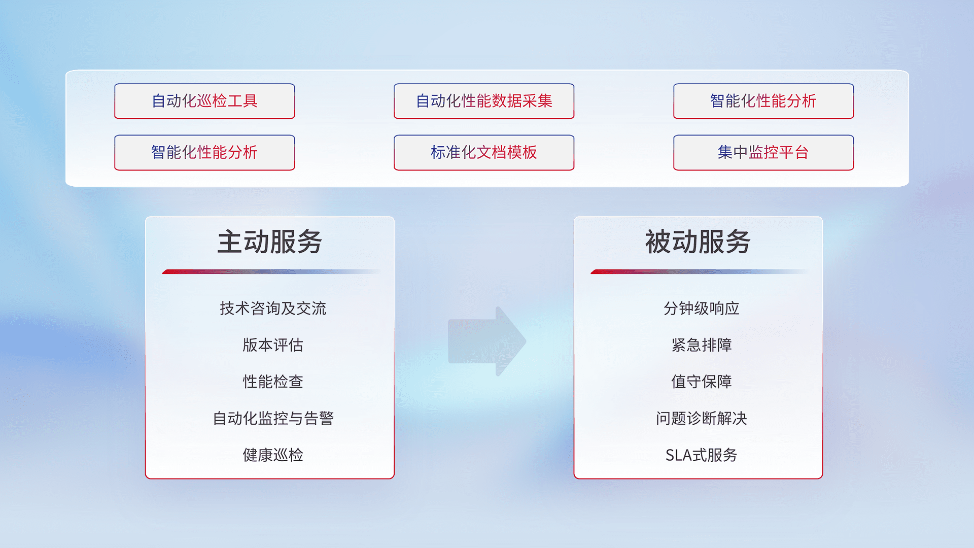 智能化工具和标准化文档,,,,保障服务质量,,,,提供主动服务(包含技术咨询、、、版本评估、、、、性能检查、、自动化监控与告警、、健康巡检)和被动服务包含(分钟级响应、、、紧急排障、、值守保障、、、、问题诊断解决、、、SLA服务)。。